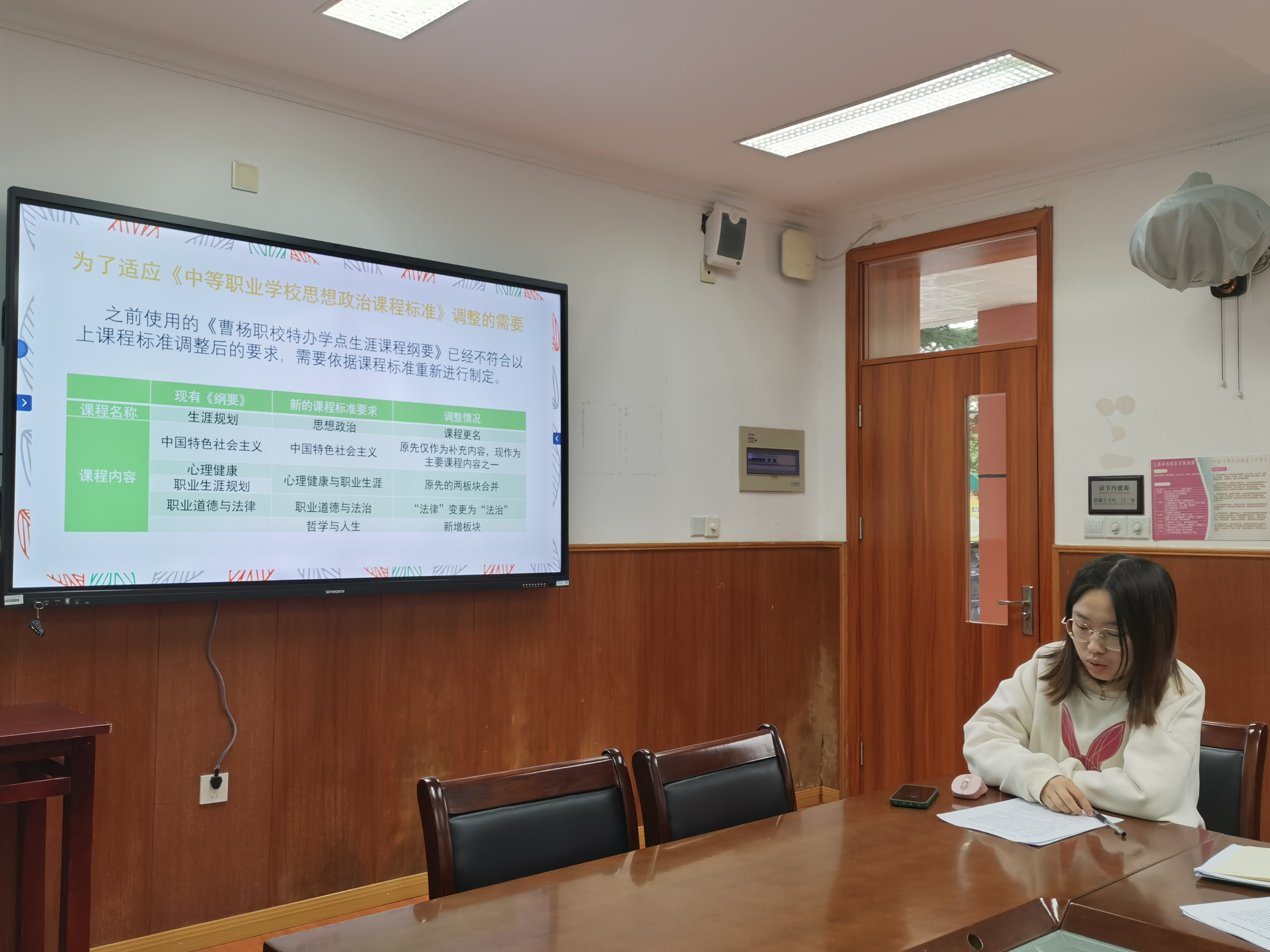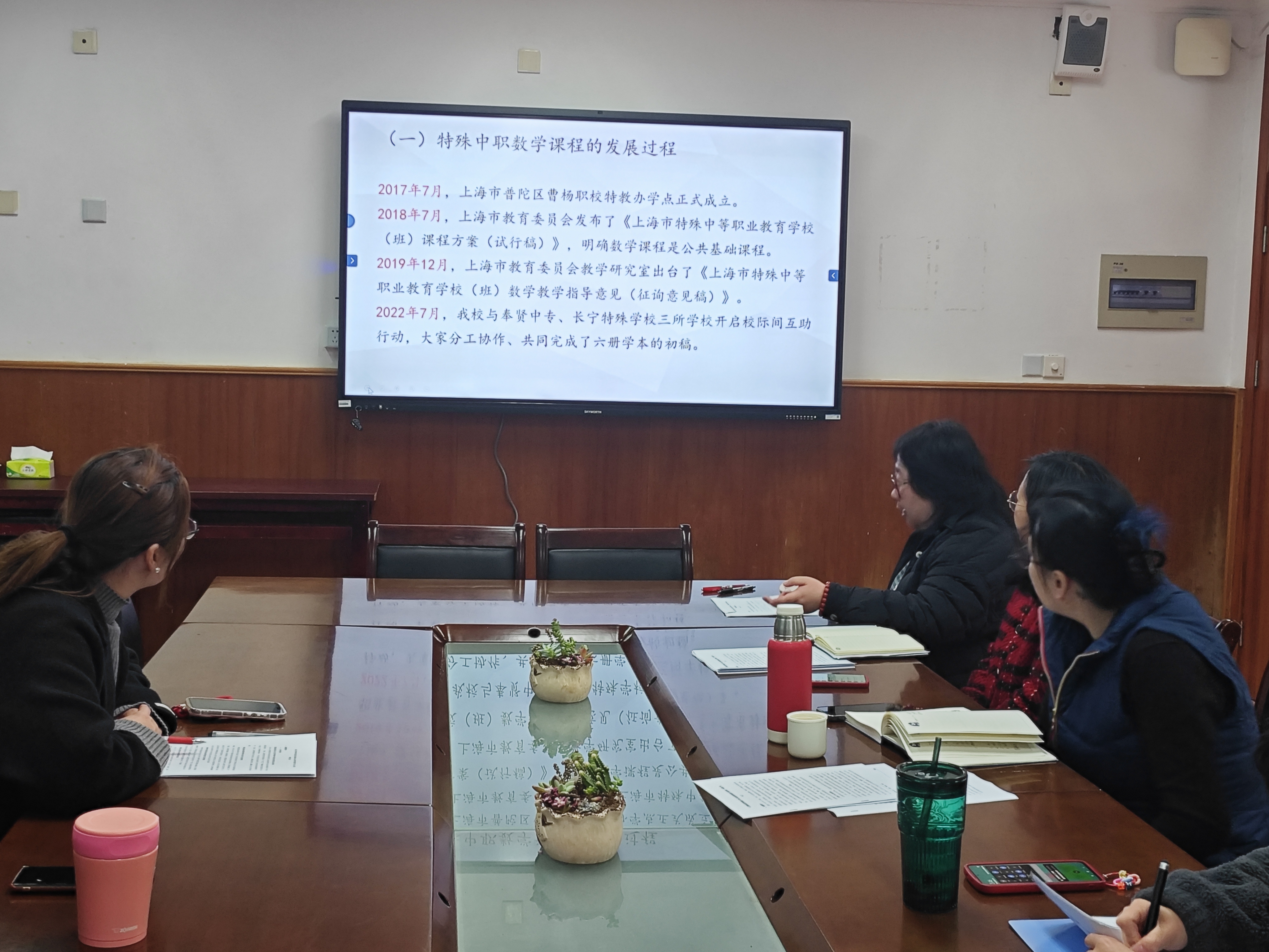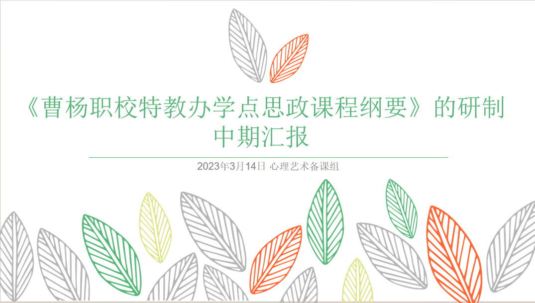 心理艺术备课组教师钱宏,结合曹杨职校特教办学点思政课程建设的现状,进行了《的研制》的中期汇报。汇报中,除介绍了研究工作的主要进展和阶段性成果以外,还进行了深入的反思,并提出了下一步研究的调整计划。